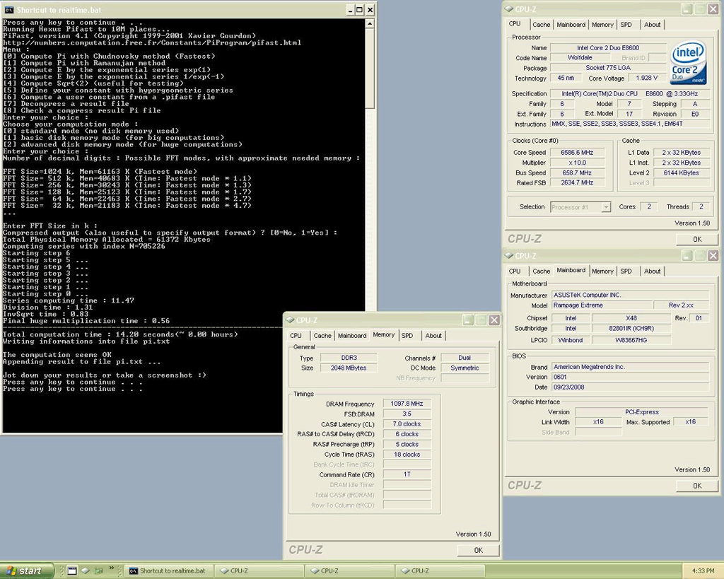 Подробности рекорда нам практически неизвестны, но о некоторых деталях можно заявить вполне официально. Очень удачный образец процессора Core 2 Duo E8600 в дуэте с материнской платой ASUS Rampage Extreme (версия BIOS 0601) смог просчитать число Pi до 1 млн. знака после запятой всего за 14,20 секунды, тем самым, обойдя африканцев на 0,03 с. Частота CPU при этом была равна 6586 МГц, который, естественно, охлаждался жидким азотом.