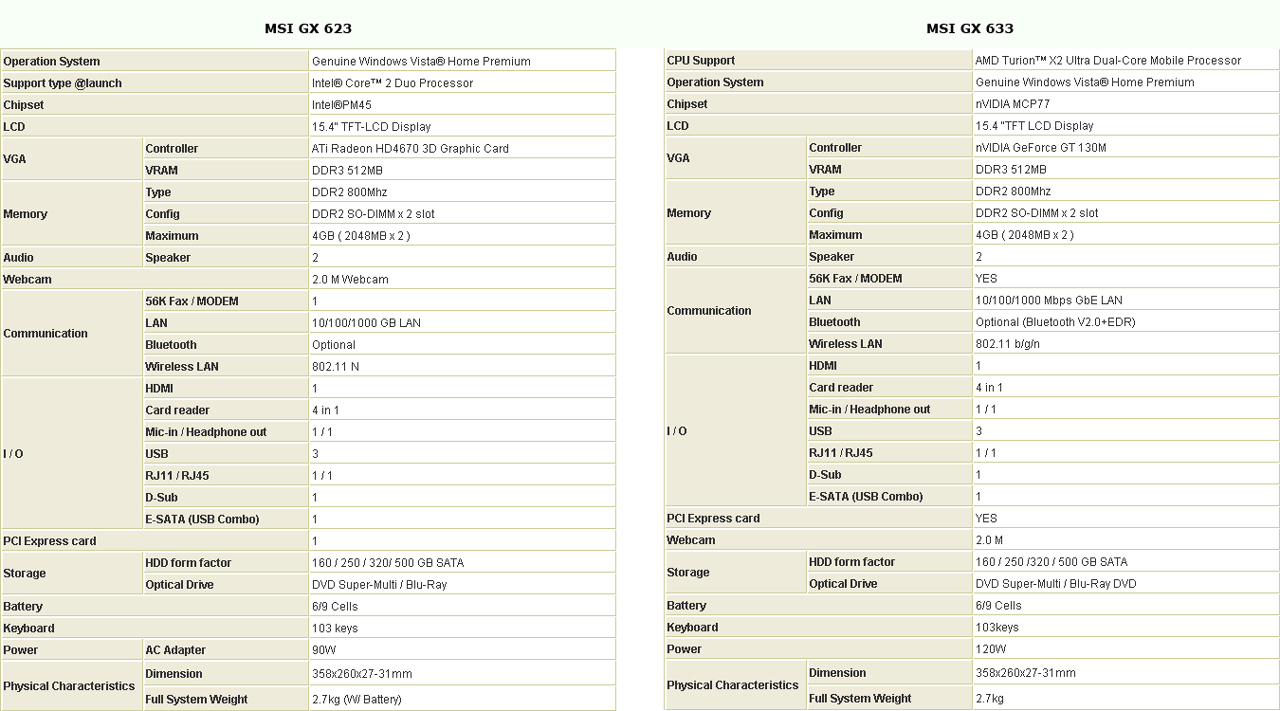 Базовые параметры типичны для современных игровых ноутбуков, обеспечивая, с некоторыми оговорками, запуск большинства популярных игр. Так, в основе MSI GX623 лежит материнская плата на чипсете PM45 с процессором Core 2 Duo и дискретной видеокартой Radeon HD 4670, а MSI GX633 содержит в себе процессор AMD Turion X2 Ultra, набор системной логики NVIDIA MCP77 и графическое решение GeForce GT 130M.