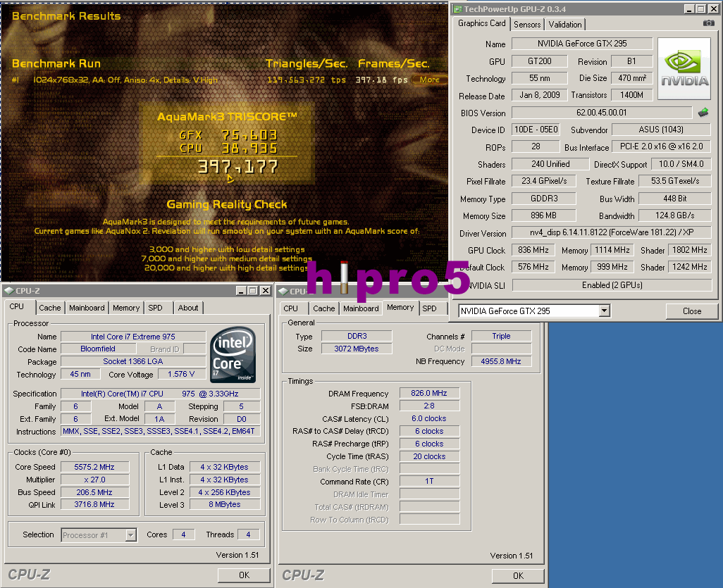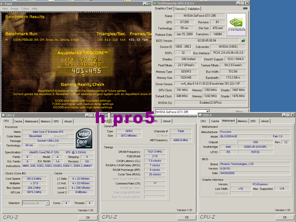 Как видим, в арсенале грека появился отборный образец процессора Core i7-975 EE, способный работать в 3D-режиме на частоте более 5,5 ГГц. В качестве материнских плат были использованы EVGA X58 SLI Classified 760 и Foxconn Blood Rage, «приютившие» дуэт ускорителей GeForce GTX 285 (категория SLI/CrossFire) и GeForce GTX 295 (категория одиночных карт).