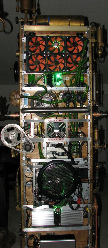 Основная масса изображенных на снимке узлов используется в контуре системы жидкостного охлаждения. Детали, возраст которых можно оценить примерно в 100 лет, закреплены на деревянном шкафчике. Сзади на довольно примитивном шасси смонтированы непосредственно компоненты ПК – система на базе Core 2 Quad Q6600 с двумя видеокартами GeForce 8800 GTX в режиме SLI и часть современных узлов СВО.