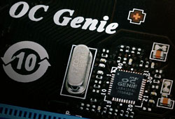 Аппаратной частью новой системы является микросхема, распаянная между слотами PCI-E x16, которую сама MSI называет «первым в мире процессором авторазгона». Итак, что же получает пользователь, приобретая материнскую плату с чипом OC Genie? Ответ прост – возможность весьма неплохо разогнать систему, затратив при этом минимум времени.