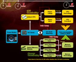 Сам процесс автооверклокинга выглядит так: перед запуском компьютера нужно нажать кнопку OC Genie, расположенную внизу материнской платы. После этого запустить систему и наслаждаться результатом. При этом OC Genie сама определит модель установленного процессора и считает SPD оперативной памяти. Далее будут найдены безопасные значения опорной частоты, множителя и напряжения процессора. Для памяти же будут определены оптимальные показатели напряжения, частоты, таймингов и множитель FSB/RAM. В заключение, настройки, определённые системой как стабильные, будут внесены в BIOS и сохранены.