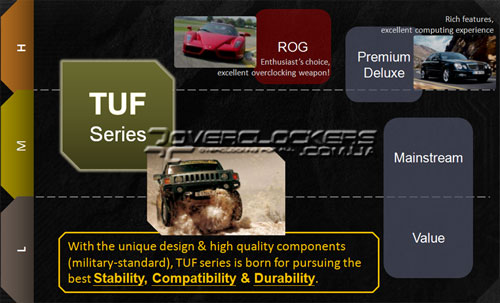 Платы TUF, в отличие от выпускающихся моделей ROG и Deluxe, займут собой в большей степени среднеуровневый сегмент рынка, т.е. по цене будут доступны рядовому пользователю, а за счет элементной базы, отвечающей военным стандартам, стабильность, совместимость и долговечность станут основной отличительной чертой решений The Ultimate Force.