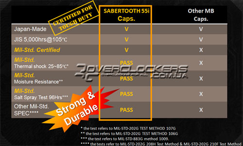 Что касается соответствия военным стандартам, то полимерные конденсаторы и силовые транзисторы будут проходить строжайший контроль и отбор — плата SaberTooth 55i как раз и станет первым продуктом, оснащенным такими компонентами.