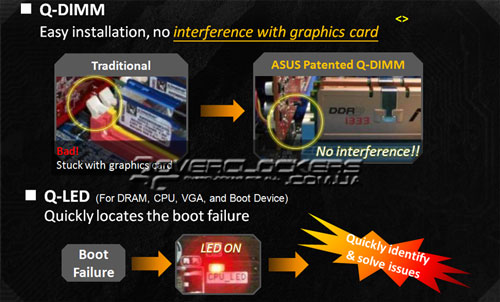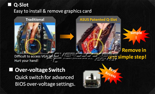 Функция Q-LED, представляющая собой набор индикаторов, позволит быстро определить проблемный компонент, тем самым решить вопрос с работоспособностью системы. Q-Slot за счет измененной формы рычажков слотов PCI-E x16 облегчит извлечение видеокарт, а переключатель Over-voltage Switch открывает доступ к более высоким напряжением в BIOS Setup.