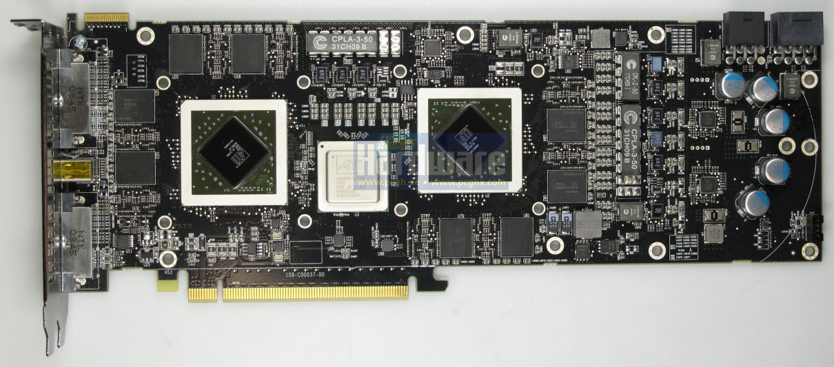 На вооружении у HD 5970 стоят два ядра RV870 XT Cypress, 4,3 млрд. транзисторов, 2 х 1600 потоковых процессоров, две 256-битных шин памяти и 2 ГБ видеопамяти GDDR5. Новинка имеет внушительную длину (33,8 см), показатель TDP (294 Вт) и ценник ($599). Взамен ее владелец получит 4,64 терафлоп вычислительной мощи.
