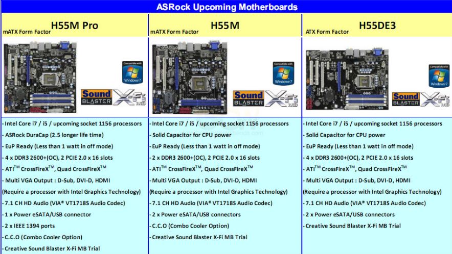 Разумеется, партнёры компании уже подготовили соответствующие модели системных плат. Одним из этих партнёров стала ASRock, которая собирается представить целую линейку решений на основе чипсета Н55. В неё войдут такие модели как H55 Pro, H55M и H55DE3.