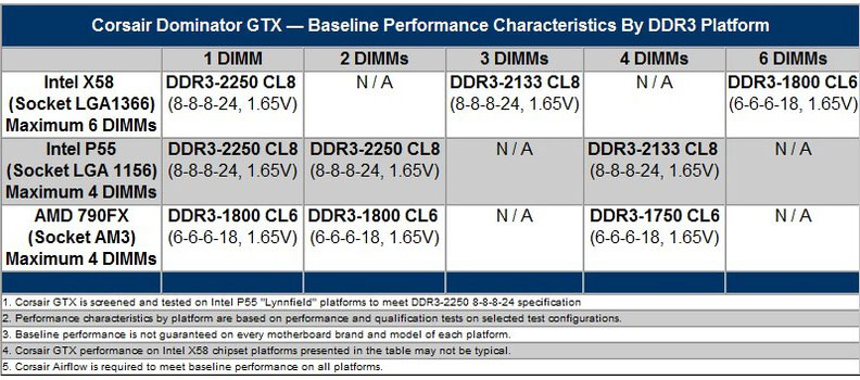 Корректная работа Dominator GTX гарантируется при функционировании на номинальной частоте 2250 МГц с задержками 8-8-8-24 в конфигурациях ПК с чипсетом Intel P55 Extreme. Взаимодействие с набором системной логики Intel X58 Extreme требует понижения частоты до 2133 МГц (если используется больше одного модуля).