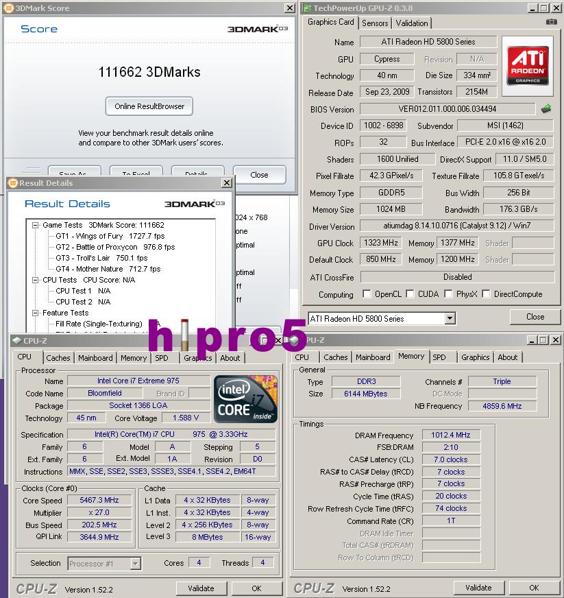 Новый ориентир в 3DMark03 теперь составляет 111662 «попугая». В конфигурации стенда hipro5 задействовал видеоускоритель Radeon HD 5870, разогнанный до 1323 МГц по чипу и до 5508 МГц по памяти, материнскую плату EVGA X58 Classified 4-Way SLI с четырехъядерником Intel Core i7-975 Extreme Edition @5467 МГц и трехканальный комплект оперативной памяти DDR3 на частоте 2025 МГц с задержками CL7. В качестве СО использовались испарители с жидким азотом на процессоре и видеочипе.
