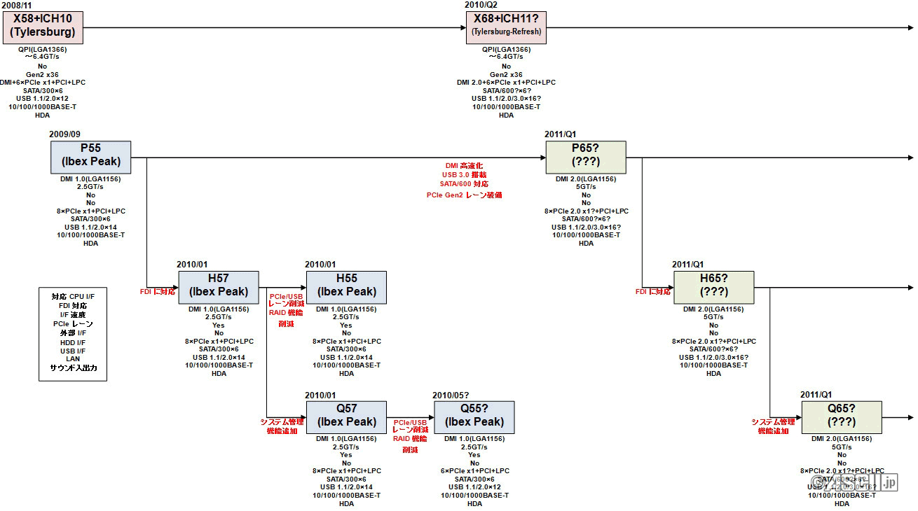 В них будет внедрена поддержка интерфейса DMI 2.0 (5 ГТ/с), имеющего вдвое большую пропускную способность, чем у нынешнего DMI первой ревизии. Кроме того, новый южный мост ICH11 получит встроенные контроллеры USB 3.0 и SATA 6 Гбит/с; 45-нм техпроцесс выпуска даст перечисленным чипсетам некоторую фору перед 65-нанометровыми Intel 5 Series в плане энергопотребления.