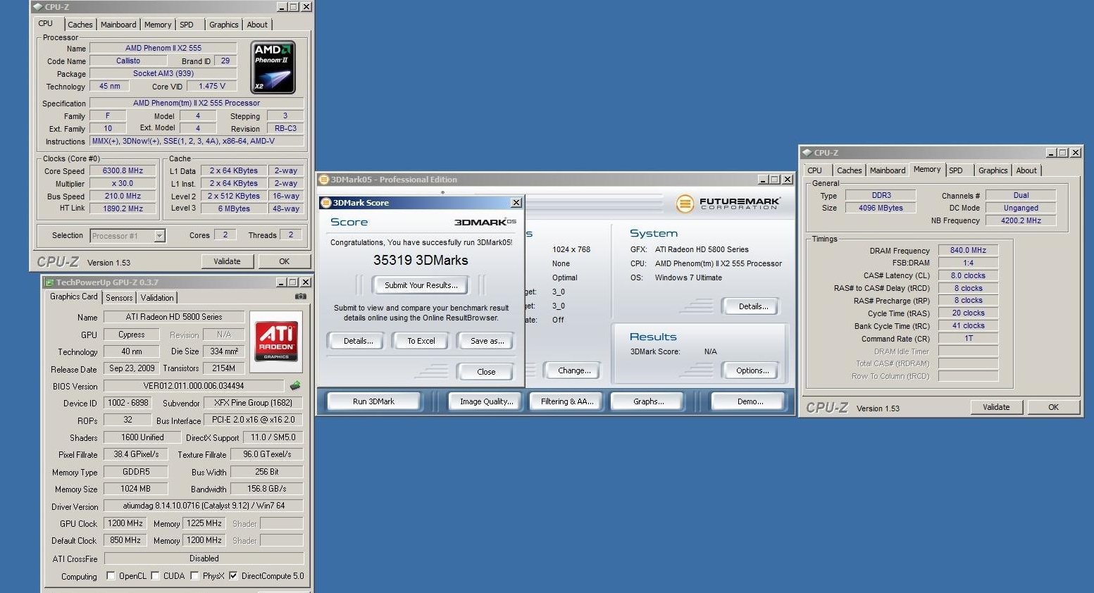 Далее на этой же системе был пройден и бенчмарк 3DMark05. Пару Phenom II X2 555 BE составила видеокарта Radeon HD 5870, разогнанная до 1200/4900 МГц по чипу и памяти соответственно. Правда, частоту процессора для успешного прохождения этого испытания пришлось снизить до 6,3 ГГц. В итоге связка набрала 35319 очков.