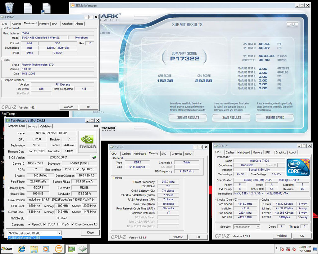 Помимо видеоакселератора, в составе конфигурации были задействованы: материнская плата EVGA X58 Classified 4-Way SLI, процессор Core i7-920, разогнанный с 2660 до 4818 МГц, трехканальный комплект оперативной памяти A-Data DDR3@1835 МГц (объем 3 х 2 ГБ, тайминги 7-7-7-19-1T) и 30 ГБ твердотельный накопитель производства OCZ.