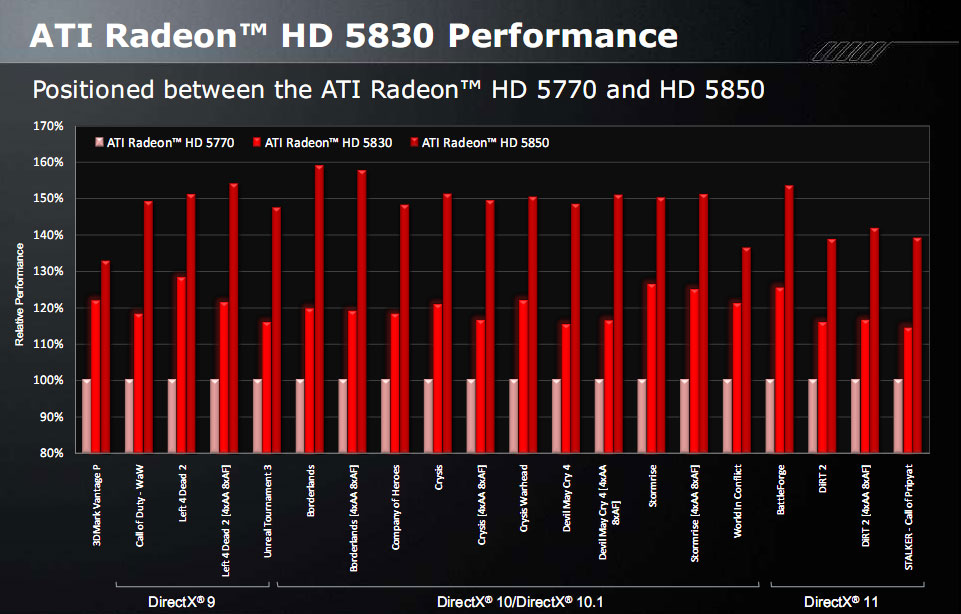 Производительность адаптера также находится между означенными картами, но все же чуть ближе к HD 5770 – сказывается сокращение числа блоков растеризации до 16 шт. Тем не менее, как указано в нижнем маркетинговом слайде, Radeon HD 5830 обеспечивает достойную производительность во многих современных играх даже в режиме Eyefinity.