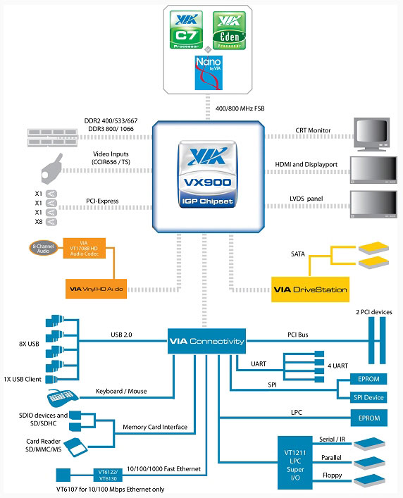 Еще один заманчивый «бонус», который воодушевит, скорее, инженеров компаний, – поддержка двух типов оперативной памяти. Модули DDR2 могут иметь эффективную частоту от 400 до 667 МГц, планки DDR3 – 800 или 1066 МГц. Кроме того, платформа VIA бережно относится к ресурсу аккумуляторной батареи, обеспечивая продолжительность автономной работы на уровне современных нетбуков с микрочипами Intel.