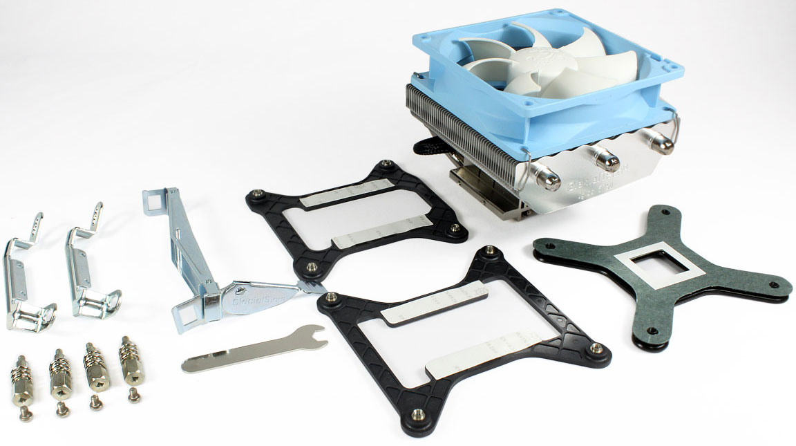При разработке GlacialTech Igloo 5760 было уделено внимание, в том числе, и эффективному обдуву околосокетного пространства, поэтому радиатор, набранный из алюминиевых пластин, ориентирован параллельно плоскости материнской платы. Три тепловые трубки, предположительно, диаметром 8 мм выходят из основания, служащего также вспомогательным теплосъемником.
