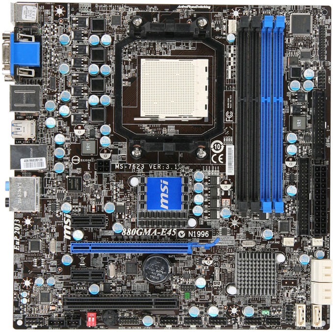 На фрагменте текстолита формата microATX нашлось место для процессорного гнезда AM3, чипсета AMD 880G со встроенным видеоядром Radeon HD 4250, четырех слотов под оперативную память DDR3 800/1066/1333/1600(OC), разъема для дискретных видеокарт PCI Express 2.0 x16, пришедших из прошлого тысячелетия интерфейсов IDE (PATA), FDD, PCI, D-Sub, RJ45 и PS/2.