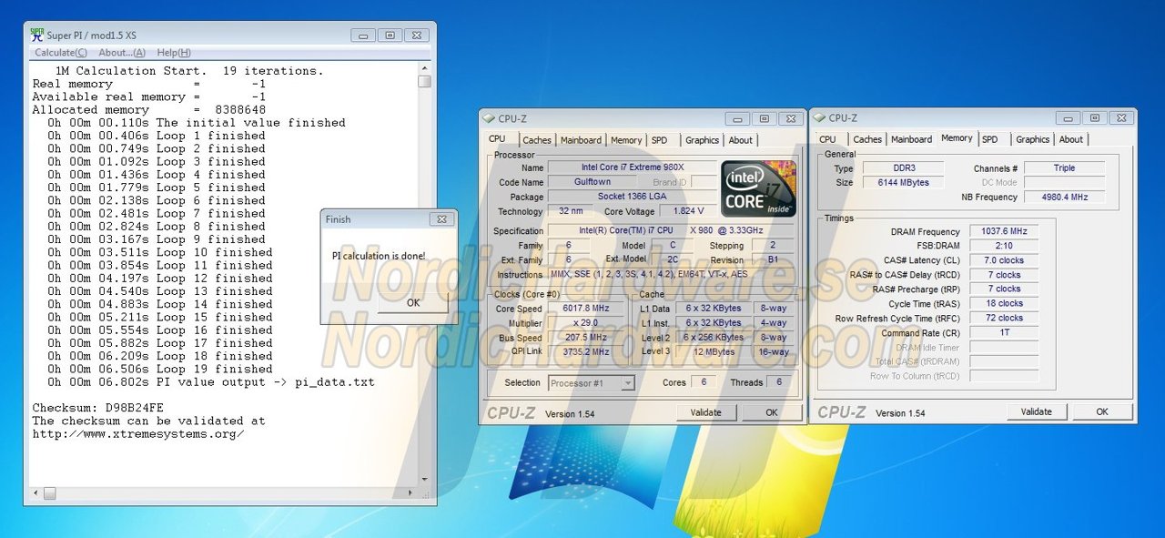 Достижение столь высокой частоты флагманского процессора компании Intel, охлаждаемого жидким азотом, позволило добиться серьезного результата в тесте SuperPi 1M — 6,802 секунды. Вместе с графическим адаптером AMD Radeon HD 5870 Eyefinity 6 Edition, который также охлаждался с помощью жидкого азота, разогнанная система набрала 419344 балла в бенчмарке трехмерной графики Aquamark3.