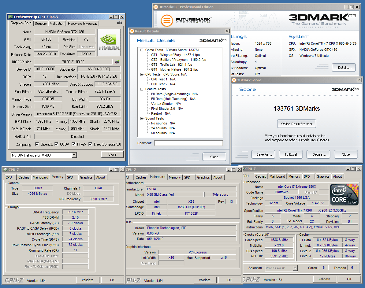 Из скриншота, снятого tsan, видно, что с номинальных 700/1401/3800 МГц (соответственно для растрового и шейдерного доменов, микросхем памяти) ему удалось разогнать Palit GTX 480 до внушительных 1320/2640/5400 МГц. Занимающий первую строчку в абсолютном зачете Hicookie поднял частоты референсного образца GeForce GTX 480 до 1360/4800 МГц по ядру/памяти.