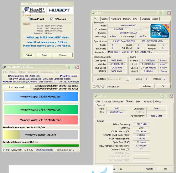 Еще более заманчиво выглядит разгон на GA-H55N-USB3 двухканального комплекта DDR3 – до эффективных 2420 МГц с таймингами 7-7-7-20 и Command Rate 1T.