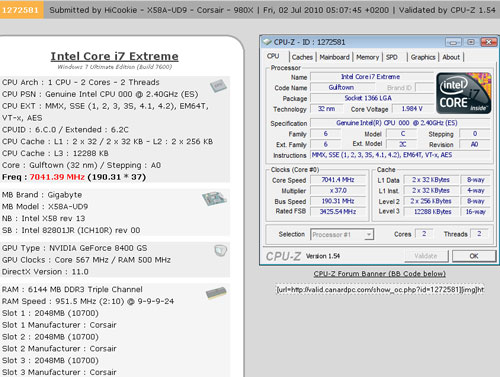 Рекордный разгон проводился на материнской плате Gigabyte GA-X58A-UD9, с использованием трехканального комплекта оперативной памяти Corsair Dominator GTX2 DDR3 3 x 2 ГБ (функционировавшего на частоте 1903 МГц) и видеокарты GeForce 8400 GS. Заметим, что напряжение на ядре Core i7-980X EE пришлось поднять до 1,984 В со штатных ~1,2 В.