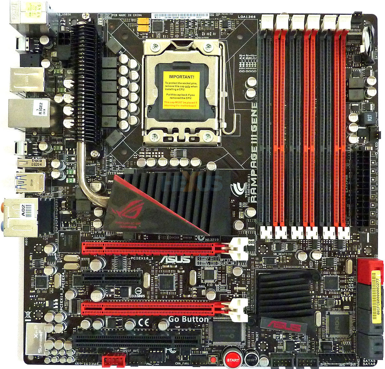 Rampage III Gene оборудована процессорным сокетом Intel LGA1366, поддерживает четырех- и шестиядерные модели Core i7, до 6 планок оперативной памяти DDR3 с частотой 1066...2200+ МГц и до двух видеокарт NVIDIA/AMD с интерфейсом подключения PCI Express x16. Пожалуй, главным нововведением относительно предшествующей Rampage II Gene является интеграция скоростных стандартов USB 3.0 и SATA 6 Гбит/с в количестве четырех (2+2) портов.