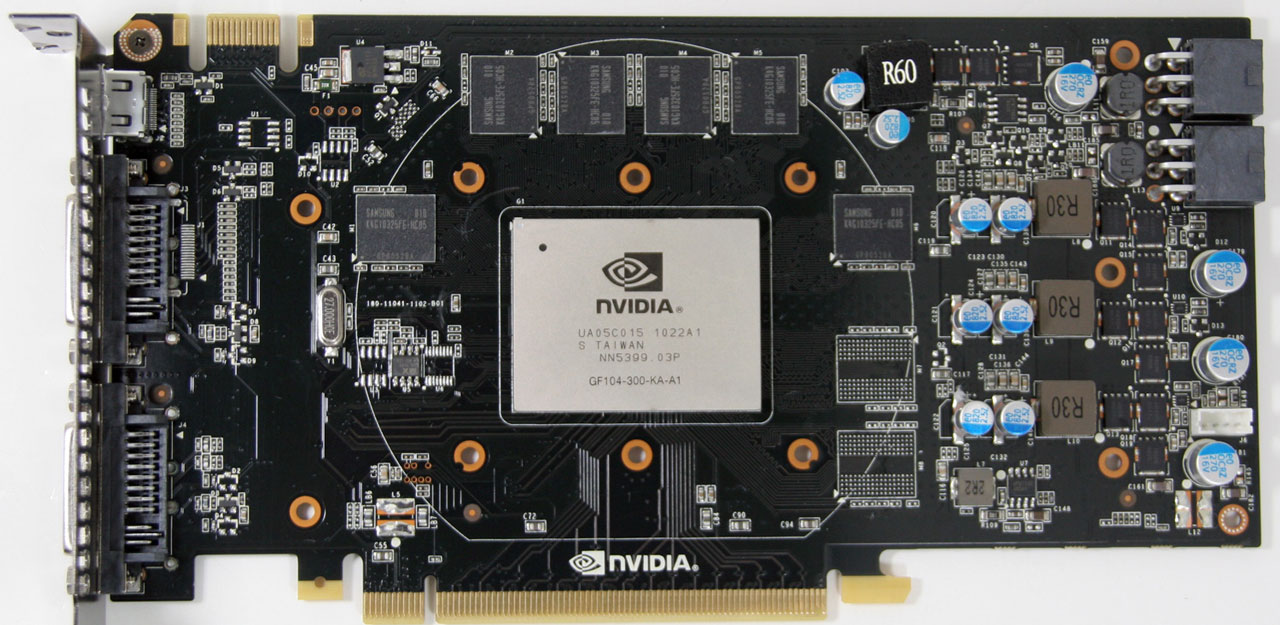 Печатная плата имеет физические размеры 210 х 111 мм. На ней распаяны: видеочип GF104-300-KA ревизии A1, шесть (восемь у 1 ГБ варианта) микросхем GDDR5, три фазы питания графического процессора, два 6-штырьковых разъема PCI-E Power.