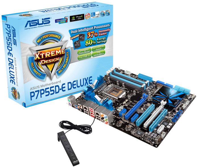 Подсистема питания ЦП выполнена по 19-фазной (16+3) схеме, дополнительное питание подается через 8-контактный разъем EPS12V. «Материнка» ASUS P7P55D-E Deluxe поддерживает все процессоры форм-фактора LGA1156, в т.ч. со свободным множителем. Слоты для памяти рассчитаны на установку двухканальных комплектов DDR3-1066/.../2200.