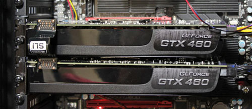 Температура видеочипа в стресс-тесте FurMark у флагманской карты референсного дизайна достигает 93°C; тандем неразогнанных карт GeForce GTX 460 работает при 82°C/66°C, связка EVGA GTX 460 768 МБ Superclocked функционирует при 84°C и 68°C соотвественно для верхней и нижней карт в корпусе Cooler Master HAF X.
