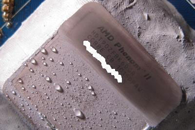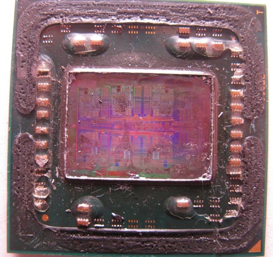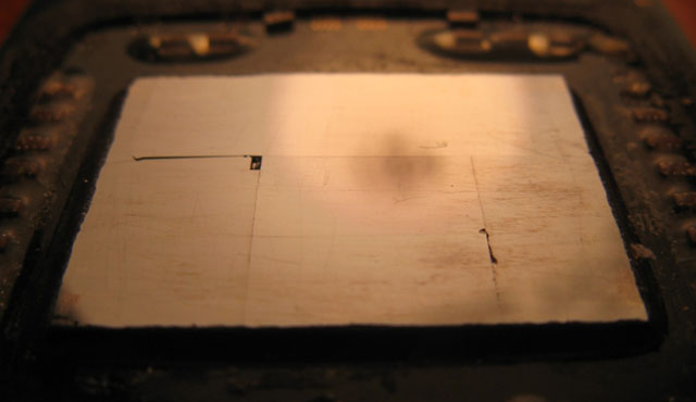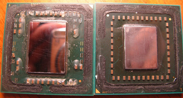 Для начала с чипа была снята защитная крышка (иногда ее еще называют теплораспределительной, однако это не совсем корректно). Оказалось, что снять крышку с Thuban без серьезных физических повреждений вспомогательных микросхем практически невозможно, поскольку, в отличие от Deneb, на эти элементы нанесено солидное количество термоклея или подобной субстанции.