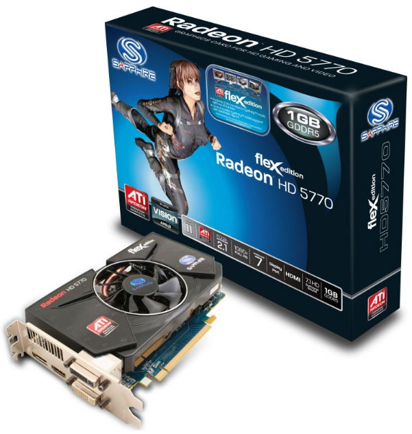 Система охлаждения Radeon HD 5770 Flex включает двухслотовый радиатор с тепловой трубкой (трубками), крупный вентилятор и кожух с логотипами разработчиков. С чипом Juniper, имеющем в своем составе 800 потоковых процессоров и 128-битный контроллер памяти, соседствует восемь микросхем GDDR5 общим объемом 1 ГБ. Таковые частоты устройства соответствуют рекомендованным – 850 МГц по ядру и 4800 МГц по памяти. Наряду с Eyefinity, карта поддерживает API DirectX 11, Shader Model 5.0 и конфигурации ATI CrossFireX.