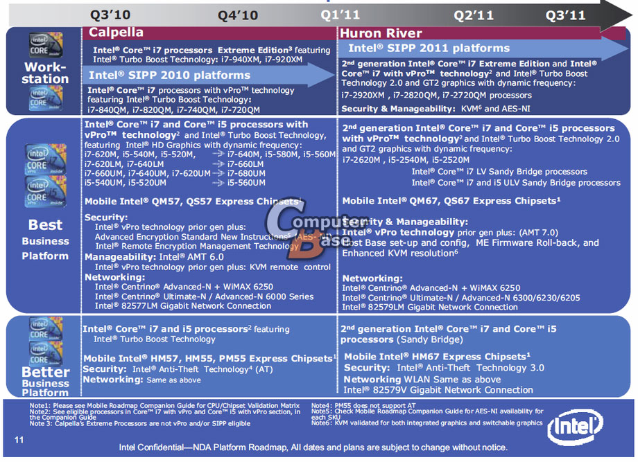 Опубликованная веб-ресурсом Computerbase предварительная таблица характеристик обнаруживает, что номинальные частоты будущих Core i3/i5/i7-2000 будут весьма умеренными. Возможно, с переходом на 22-нм техпроцесс (Ivy Bridge), 4-гигагерцовый барьер будет, наконец, преодолен.