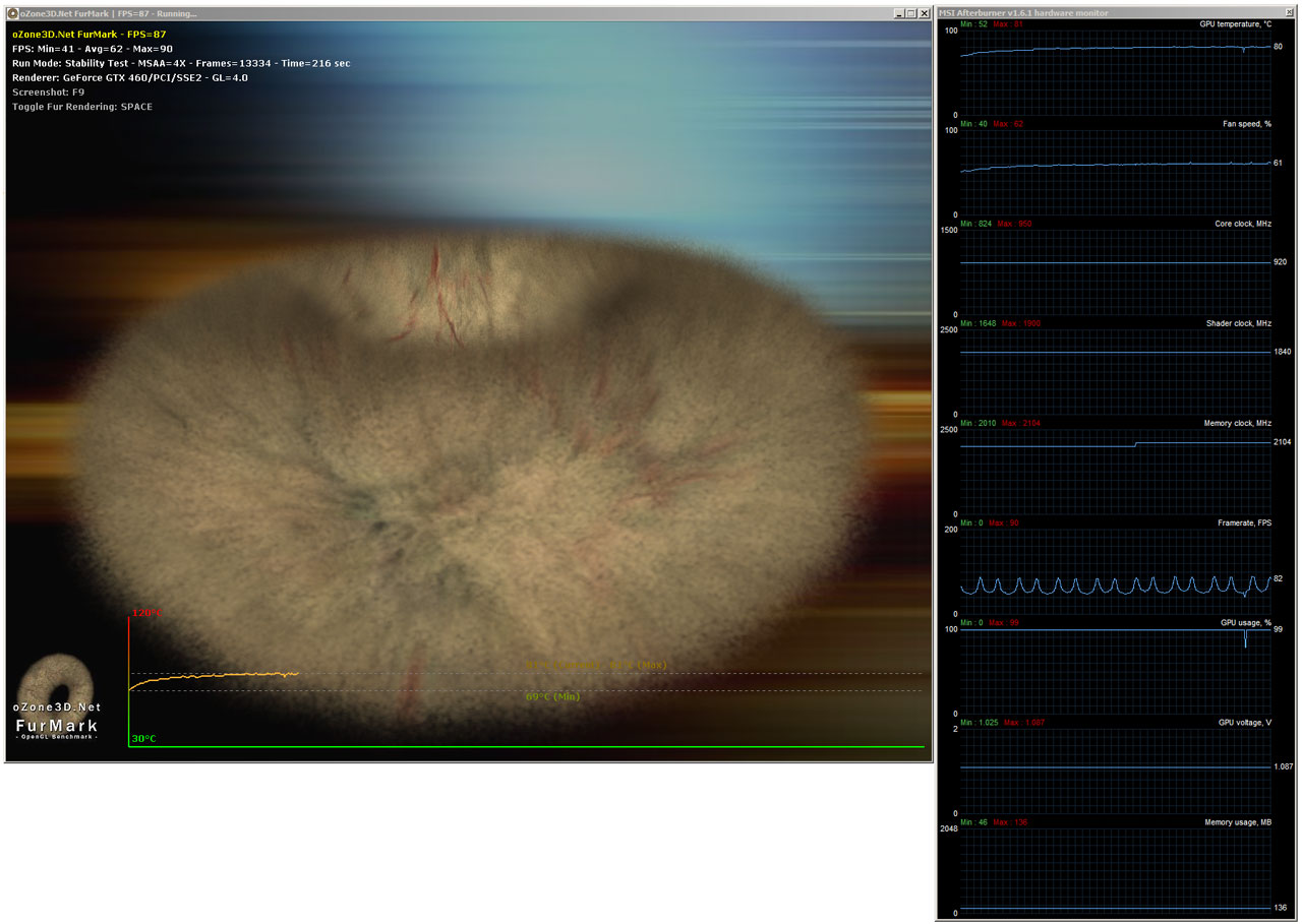 Новинка успешно прошла испытание утилитой FurMark на частотах 920/1840/4208 МГц для растрового, шейдерного доменов и микросхем памяти соответственно. Для этого пришлось повысить напряжение на ядре до 1,087 В (через MSI Afterburner), тем не менее, температура чипа не поднялась выше 80°C. Энергопотребление системы в нагрузке выросло с разгоном на 43 ватта.