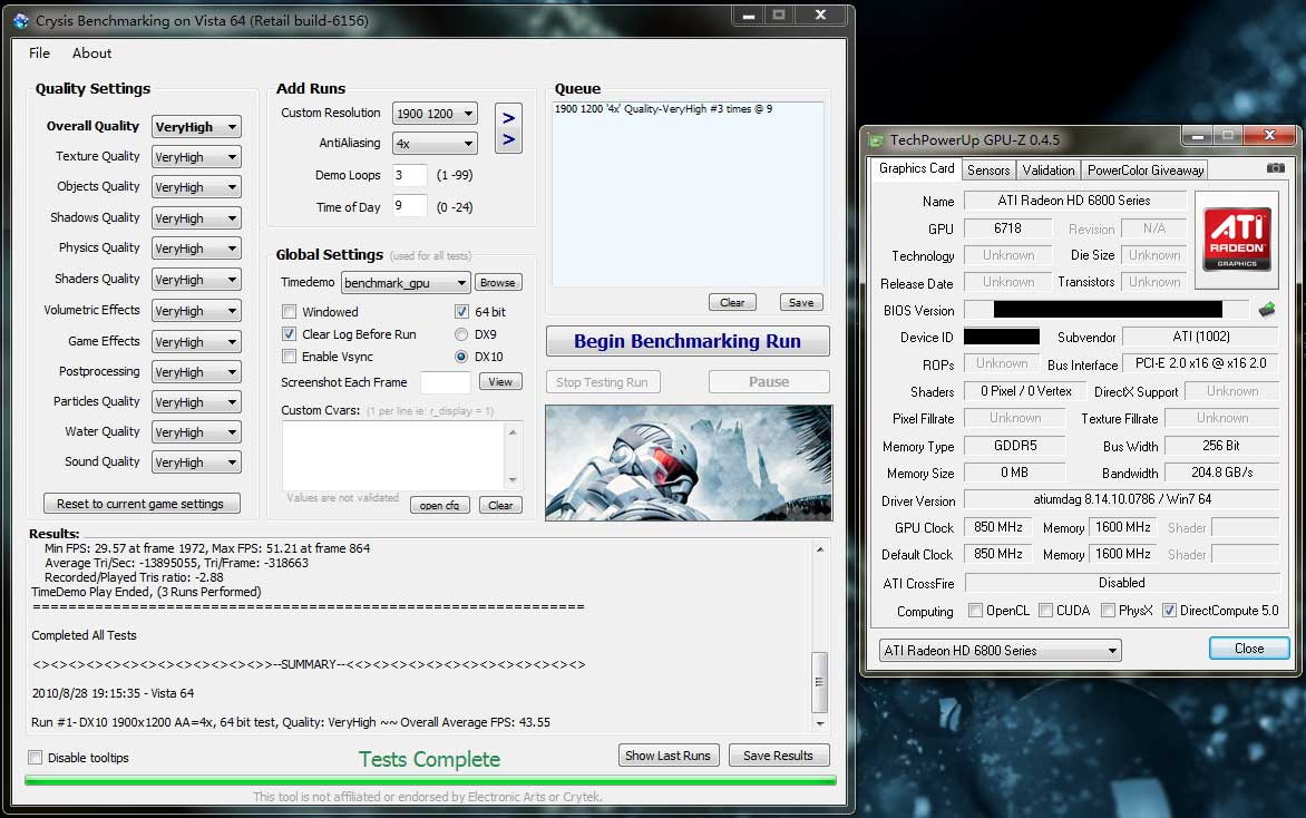 Еще интереснее Radeon HD 6870 смотрится в бенчмарках Crysis и Unigine Heaven v.2.1. В Full HD-разрешении, на высоких настройках качества и со сглаживанием карта обеспечивает минимальный фреймрейт в Crysis на уровне 29,57 кадров в секунду и средний – 43,55 к/с, существенно превосходя и GeForce GTX 480, и Radeon HD 5870.