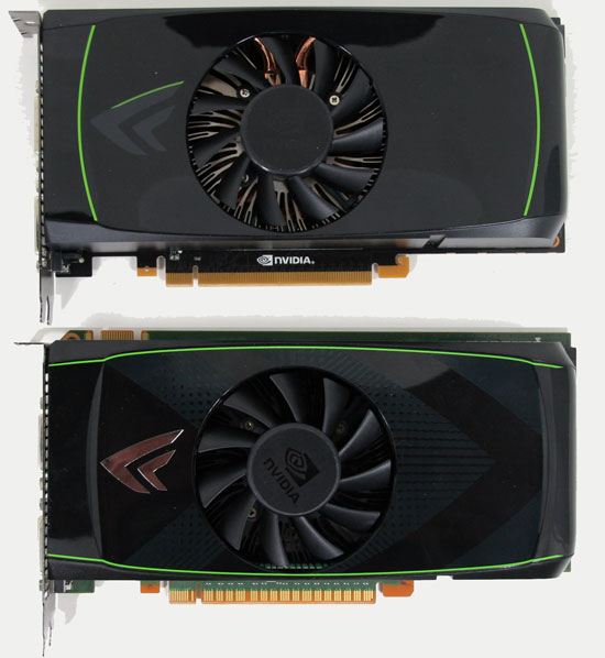Перепутать GeForce GTS 450 со «старшим братом» GTX 460 очень легко. Обе карты имеют одинаковую длину, идентичный набор видеовыходов в составе двух DVI-I и единичного mini HDMI, один разъем SLI. Явных отличительных признаков два: референсная GTX 460 оборудована двумя шестиконтактными разъемами PCI-E Power, а GTS 450 – одним. Кроме того, кулер сегодняшнего дебютанта не содержит тепловых трубок.