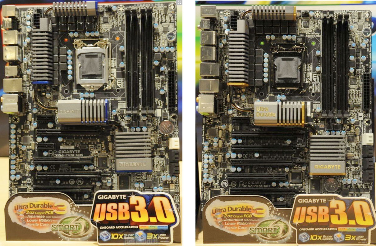 «Сладкая парочка» Gigabyte GA-P67A-UD5 и GA-P67A-UD7 предлагает разместить на себе две (UD5) или четыре дискретные (UD7) видеокарты, предоставляет возможность в полной мере ощутить преимущества стандартов SATA 3 и USB 3.0; к тому же старшее решение обладает двойным гигабитным сетевым контроллером.