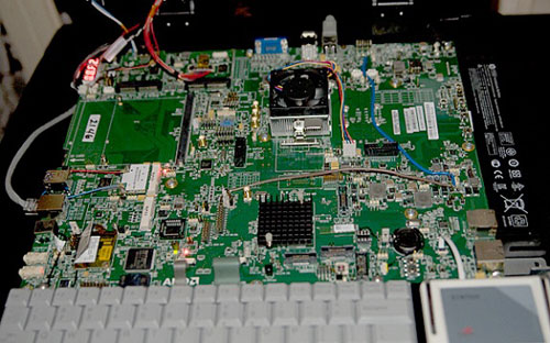 На фотоснимке выше запечатлена экспериментальная материнская плата для полноразмерного ноутбука на базе старшей модификации гибридного процессора Zacate. Несмотря на высокий уровень энергоэффективности новейших платформ, продемонстрированный на фото тестовый стенд предусматривает наличие небольшой активной системы воздушного охлаждения ЦП, необходимой для эффективного отвода тепла в условиях малогабаритного корпуса стандартного ноутбука. Сообщается, что подготавливаемые сразу несколькими азиатскими производителями к скорому дебюту, настольные материнские платы форм-фактора Mini-ITX на базе APU Fusion будут оборудованы пассивными системами охлаждения в виде крупных алюминиевых радиаторов с медными теплотрубками.
