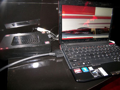 Напомним, что полтора года назад AMD представила XGP Lasso, который для подключения нуждался в специальном разъеме и потому мог работать в тандеме лишь с одним ноутбуком – Fujitsu Siemens. Другим существенным недостатком адаптера явилась необходимость подключения внешнего монитора. Продолжая двигаться по пути создания конкурентноспособной внешней графики, AMD в начале текущего года сумела подключить видеокарты серии Radeon HD 5x00 с поддержкой DirectX 11 к ноутбукам Acer Ferrari. Под вопросом по-прежнему осталась возможность ускорения 3D-графики на экране ноутбука, а также мобильность графической периферии ввиду ее внушительных размеров.
