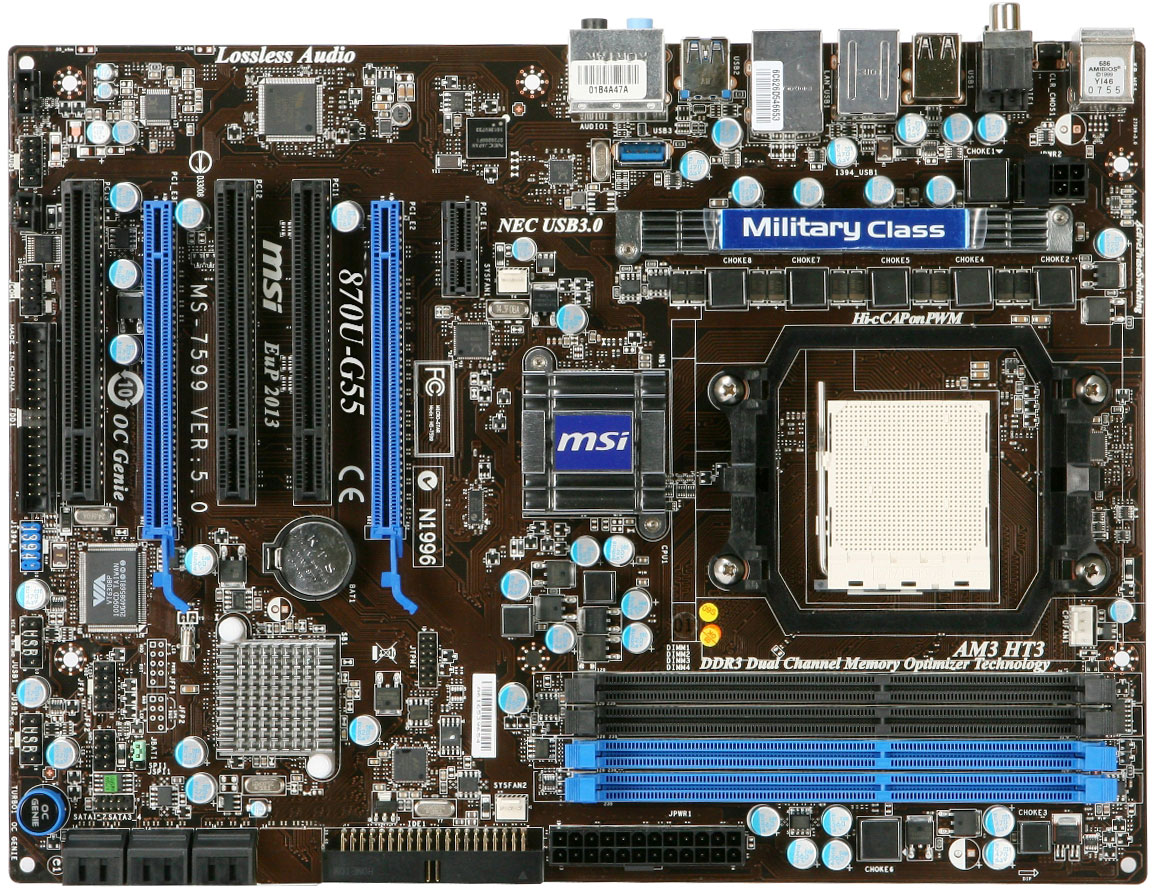 MSI 870U-G55 допускает установку двух видеокарт AMD/ATI Radeon, одного устройства с интерфейсом PCIe x1 и до трех карт PCI. Кроме того, на PCB имеются гигабитный сетевой контроллер, аудиоконтроллер, единичный IDE и шесть SATA-портов с теоретической пропускной способностью до 3 Гбит/с.