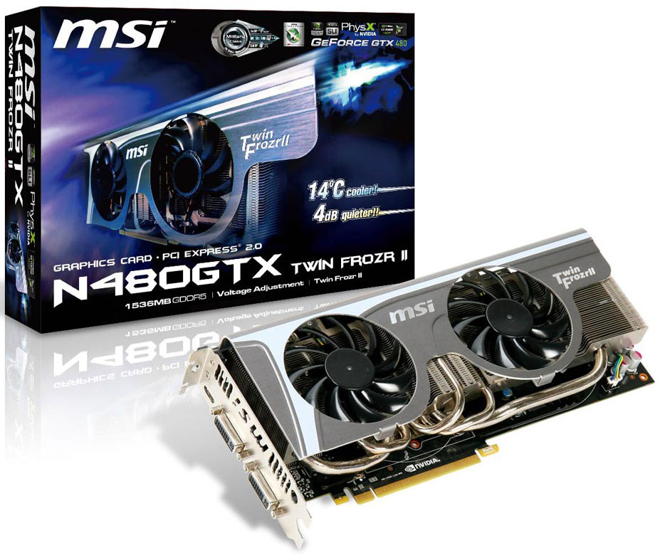 Температурный режим в данном случае должен быть более или менее комфортным: по сравнению со стоковой GeForce GTX 480, MSI N480GTX Twin Frozr II обещает снижение тепловой нагрузки на графический процессор на величину до 14°C. Частотные параметры, количество потоковых процессоров, ширина шины памяти, объем видеопамяти и перечень поддерживаемых технологий полностью соответствуют рекомендациям NVIDIA. В этом читатель может убедиться самостоятельно, ознакомившись с характеристиками продукта на официальном сайте MSI.