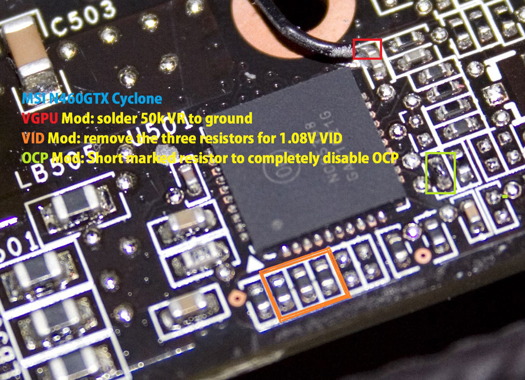 Красным обозначено место пайки резистора на 50 кОм к «земле» для вольтмода GPU, оранжевым выделены три резистора, которые необходимо аккуратно отпаять для получения 1,08 В VID. Полное устранение автоматической защиты от перегрузки по току осуществляется через замыкание обведенного зеленым цветом резистора.