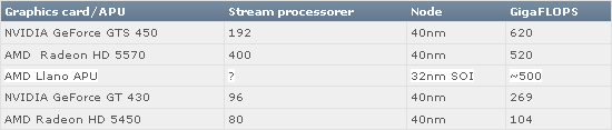Для наглядной оценки величины 500 Гфлопс и сравнения с некоторыми дискретными видеокартами на суд публики была представлена следующая таблица: