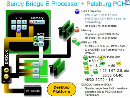 Помимо вычислительных x86-ядер, кристалл Sandy Bridge E будет содержать солидный объем кэш-памяти третьего уровня, контроллер ОЗУ, поддерживающий модули DDR3 с частотой 2666 МГц и более, и только 24 линии PCI Express 2.0. Таким образом, компании-производители материнских плат будут вынуждены использовать дополнительные чипы (например, nForce 200, Hydra Engine, PLX PEX) для расширения функциональных возможностей high-end-решений.