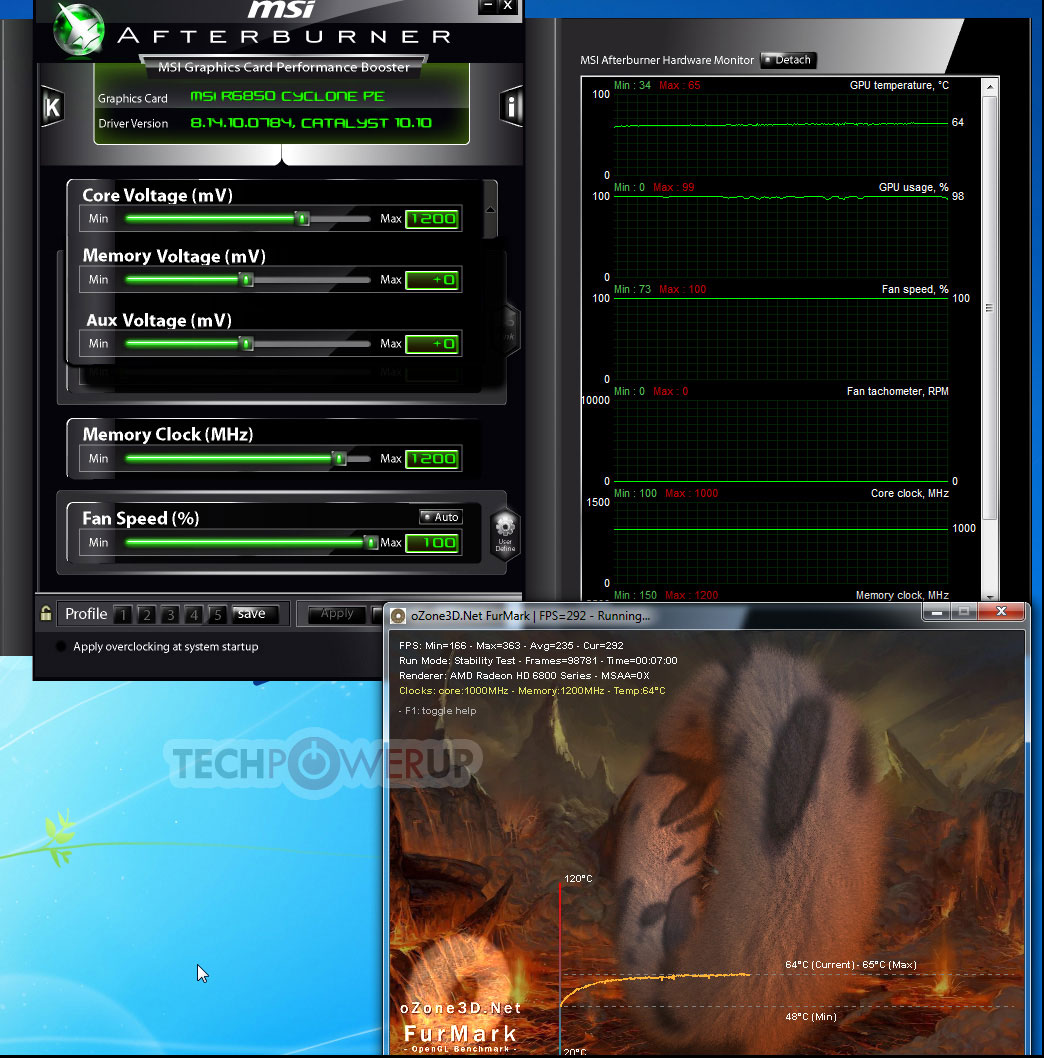 Опытному образцу покорились 1000 МГц по чипу и 1200 МГц (4800 МГц QDR) по памяти. Необходимым условием при этом стало повышение напряжения на GPU с 1,1 В до 1,2 В и повышение интенсивности вращения вентилятора до 100%. Ядро прогрелось всего лишь до 65°C в стресс-тесте FurMark.