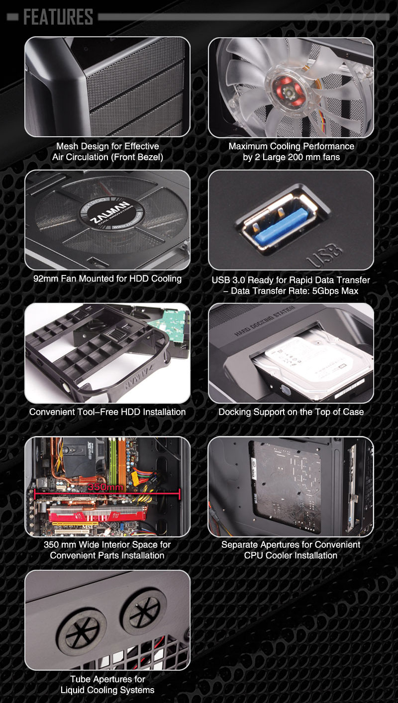 Комплектных вентиляторов пять: два со светодиодной подсветкой установлены спереди для обдува винчестеров, сверху и на боковой крышке закреплены 200-мм «карлсоны» с синей подсветкой, на задней стенке приютился 120-мм вентилятор. Два отверстия для шлангов СВО порадуют энтузиастов, а тем, кому часто приходится переносить большие объемы данных, пригодится расположенная сверху док-станция.