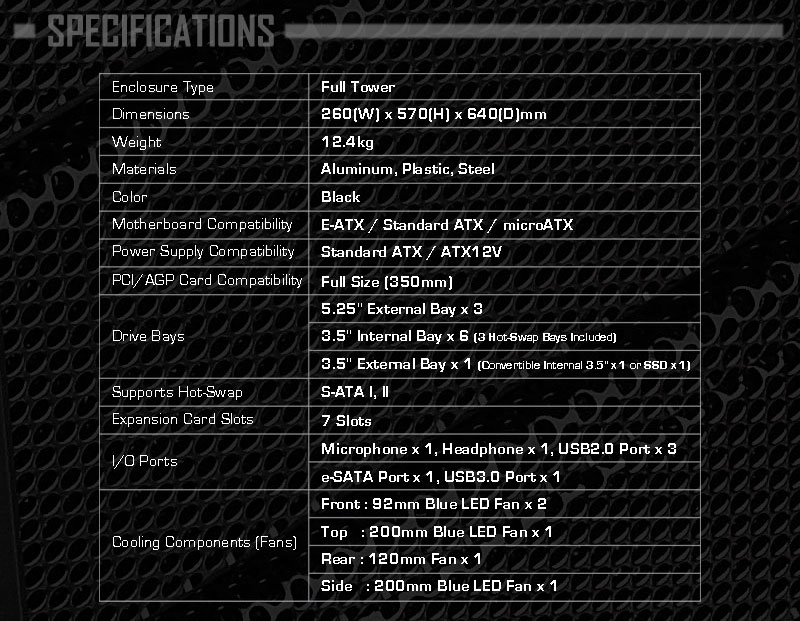 Как упоминалось ранее, GS1200 предполагает инсталляцию материнской платы форм-фактора E-ATX, ATX или microATX, ATX-совместимого блока питания, до трех 5,25-дюймовых и шести 3,5-дюймовых накопителей, а также нескольких видеоадаптеров длиной до 350 мм. Кроме того, внутри можно разместить до семи карт расширения.