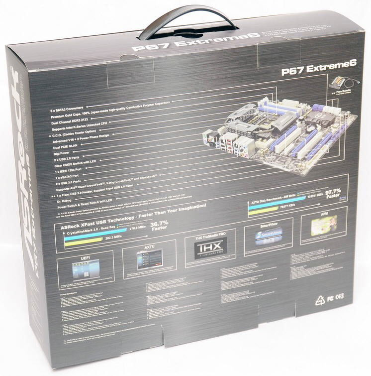 На тыльной стороне коробки перечислены основные возможности платы. В частности подчеркивается, что порты USB 3.0 будут работать быстрее, чем на других «материнках», благодаря интеграции дополнительного чипа-коммутатора PLX. На смену BIOS пришел универсальный интерфейс UEFI.