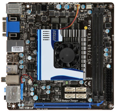 Выше изображена новинка MSI E350IA-E45, выполненная в формате Mini-ITX. Под небольшим активным кулером, помимо x86-совместимого процессора, скрывается чипсет Hudson M1. С его помощью реализованы интерфейсы Serial ATA 6 Гбит/с (4 порта) и USB 2.0 (6 портов). По соседству с сокетом распаяны разъемы DDR3-800/1066 и единичный PCI Express x16. Задняя панель содержит порты USB 3.0 (2), Gigabit Ethernet, оптический и коаксиальный S/PDIF, аудиоразъемы Mini-Jack, видеовыходы HDMI, DVI-D и D-Sub (VGA).