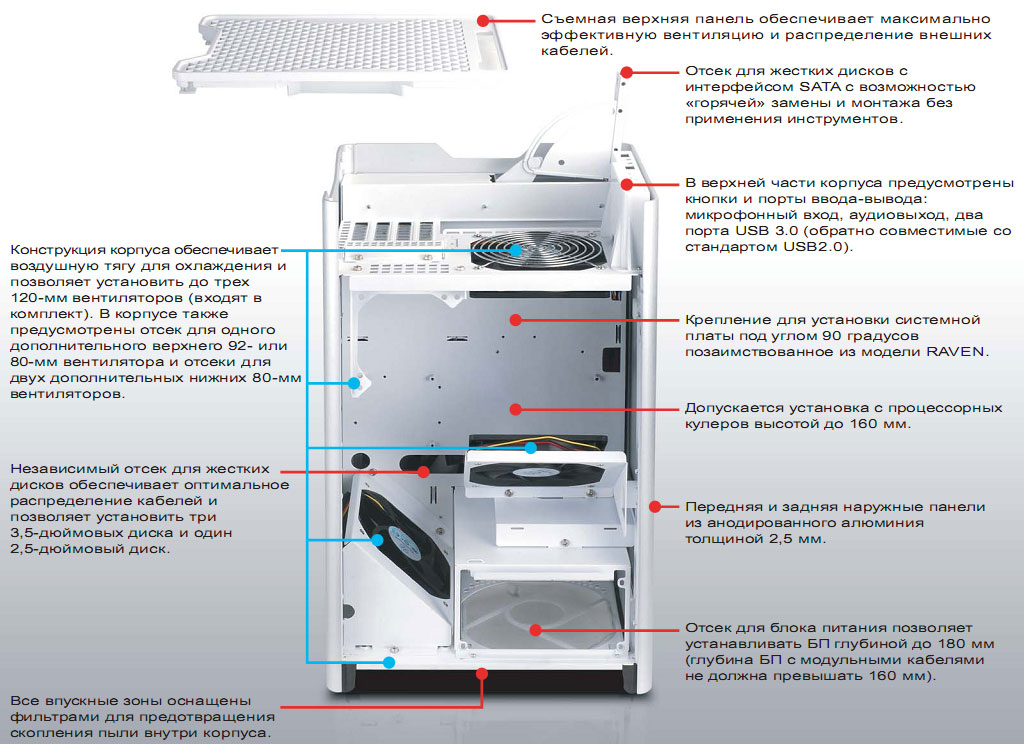 Места крепления комплектующих просматриваются не столь очевидно, как обычно, поэтому для наглядности приведем фрагмент PDF-документа, посвященного SilverStone Fortress FT03: