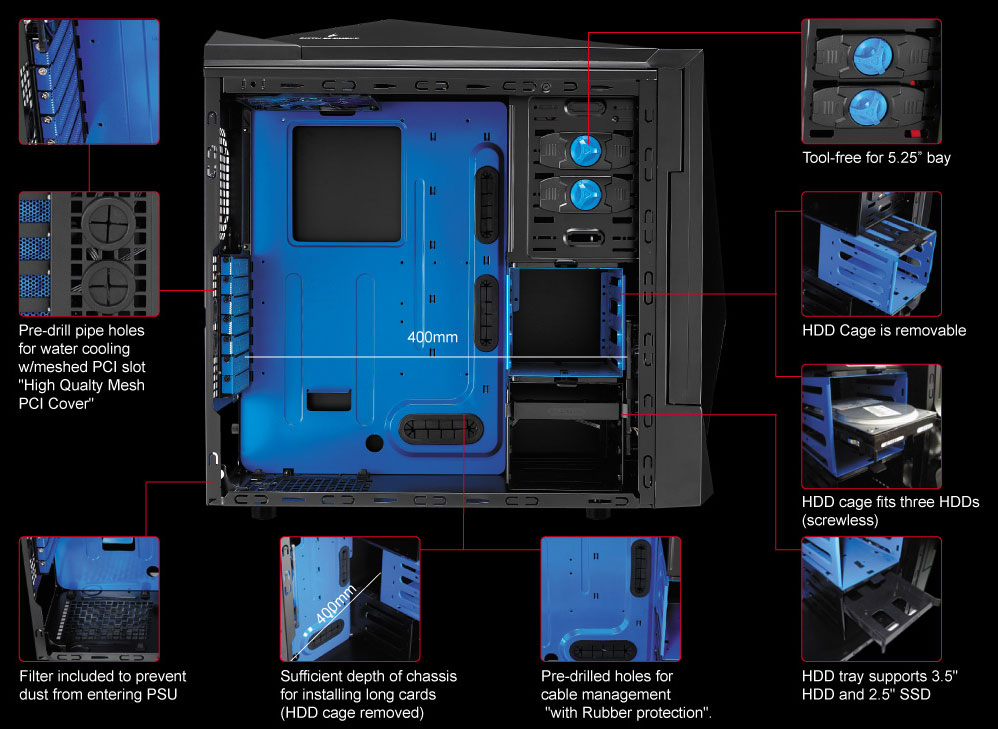 В комплект поставки входят два 140-мм вентилятора со светодиодной подсветкой. Каждый из них вращается со скоростью 1500 об/мин, перенося до 96,5 кубических футов воздуха в минуту. Заявленный уровень шума не превышает 29,6 дБА. На переднем торце шасси расположена панель ввода-вывода в составе пары USB 2.0, единичного eSATA, разъемов для наушников и микрофона.