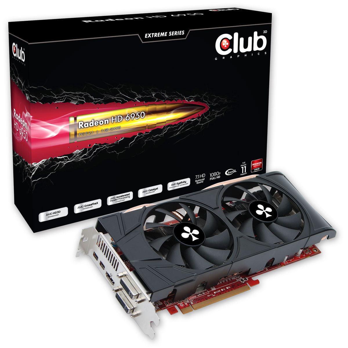 Club 3D Radeon HD 6950 1 ГБ (код модели – CGAX-69524F) снабжен 1408 потоковыми процессорами, 256-битной шиной памяти, 1024 МБ ОЗУ и имеет формулу частот 800/5000 МГц для ядра и памяти соответственно. Вывод изображения осуществляется посредством портов DVI (2), HDMI и Mini-DisplayPort (2), также видеокарта поддерживает разнообразные режимы CrossFire.